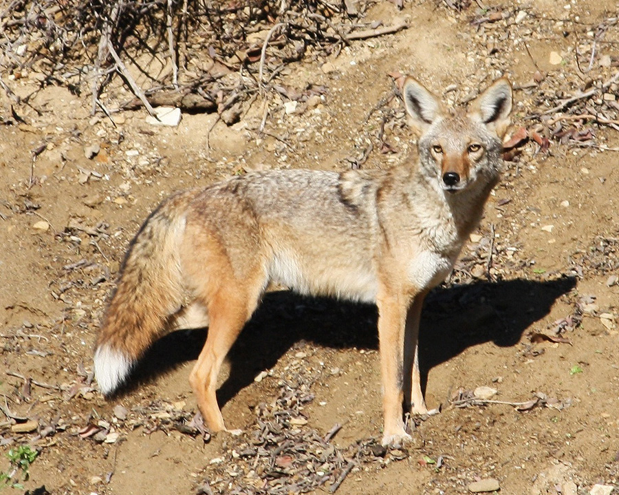 Yesterday morning, I spotted three coyotes in the backyard. We don’t usually see them during the day but this was 9:00 a.m.. I was at the kitchen window and saw some movement and assumed it was a deer but I still enjoy taking their pictures. So I grabbed the camera and ran out to find a very large coyote who stopped to look at me and then walked away.