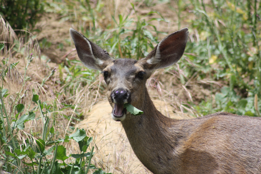 I just planted some flowers on the hill behind my house and today I looked out and this deer is stuffing her fat face with everything she can find. I kept yelling, “Go away! This is not a buffet!” She didn’t even look up. So I barked, trying to sound like a coyote and not a chihuahua, and she finally looked up, still chewing, as if to say, “What’s all the racket? Can you hold it down, I’m trying to have lunch here.”